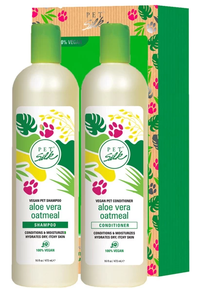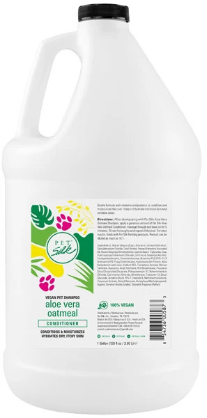 Na de vacht gewassen te hebben met Pet Silk Aloe Vera Oatmeal Shampoo, breng Pet Silk Aloe Vera Oatmeal Conditioner gelijkmatig op en masseer het voor 3 tot 5 minuten grondig in. Spoel de conditioner uit de vacht. Voor het beste resultaat eindigen met een van de Pet Silk finishing producten.