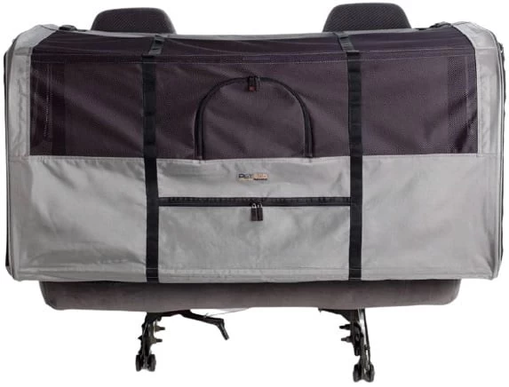 Deze bijzondere reisbench voor de hond bevestig je met het ISOFIX systeem in de auto, net zoals bijvoorbeeld een kinderzitje. Hierdoor is de hond veilig tijdens het rijden in de auto. De bench is eenvoudig op te zetten en kun je net zo gemakkelijk weer inklappen. Je draagt de bench gemakkelijk mee in de handige draagtas die inclusief is. De hondenbench heeft aan beide kanten een ingang met een stevige ritssluiting. Aan de voorzijde vindt je diverse ramen van gaas die geopend kunnen worden met een ritssluiting zodat je je huisdier kunt bereiken terwijl de auto rijdt. Aan de voorzijde bevindt zich een opbergvakje voor bijvoorbeeld iets lekkers voor de hond. Door het gebruik van de bench bescherm je het interieur van de auto tegen vuil en vlekken.