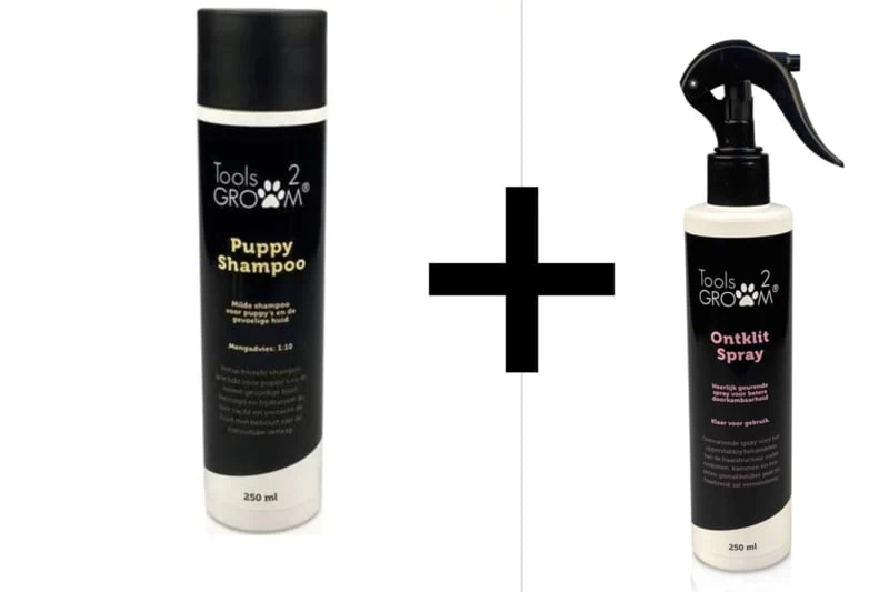 Deze set bestaat uit een heerlijke geurende puppyshampoo 250 ml en ontklitspray 250ml.