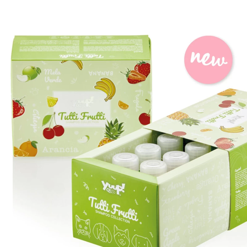 Een speciale collectie van 6 flesjes shampoos van 30 ml voor honden en katten geschikt voor alle rassen en geïnspireerd op de geuren en kleuren van fruit: Aardbei, Banaan, Groene Appel, Ananas, Kers en Sinaasappel.